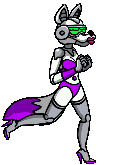 Su apariencia es de un canino robotico femenino. Posee detalles en morado, como sus muñequeas, tacones, punta de la cola, etc.