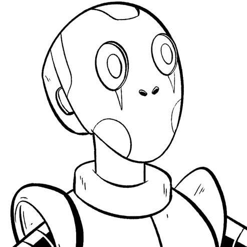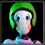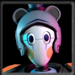 Un bot S.T.A.F.F. colorato con accenti blu pallido e blu scuro. Il suo torso è a strisce bianche e nere con linee rosa che fungono da bretelle dipinte, e anche le sue guance e i suoi fili sono colorati di rosa, questo robot si chiama Bot Mimo.