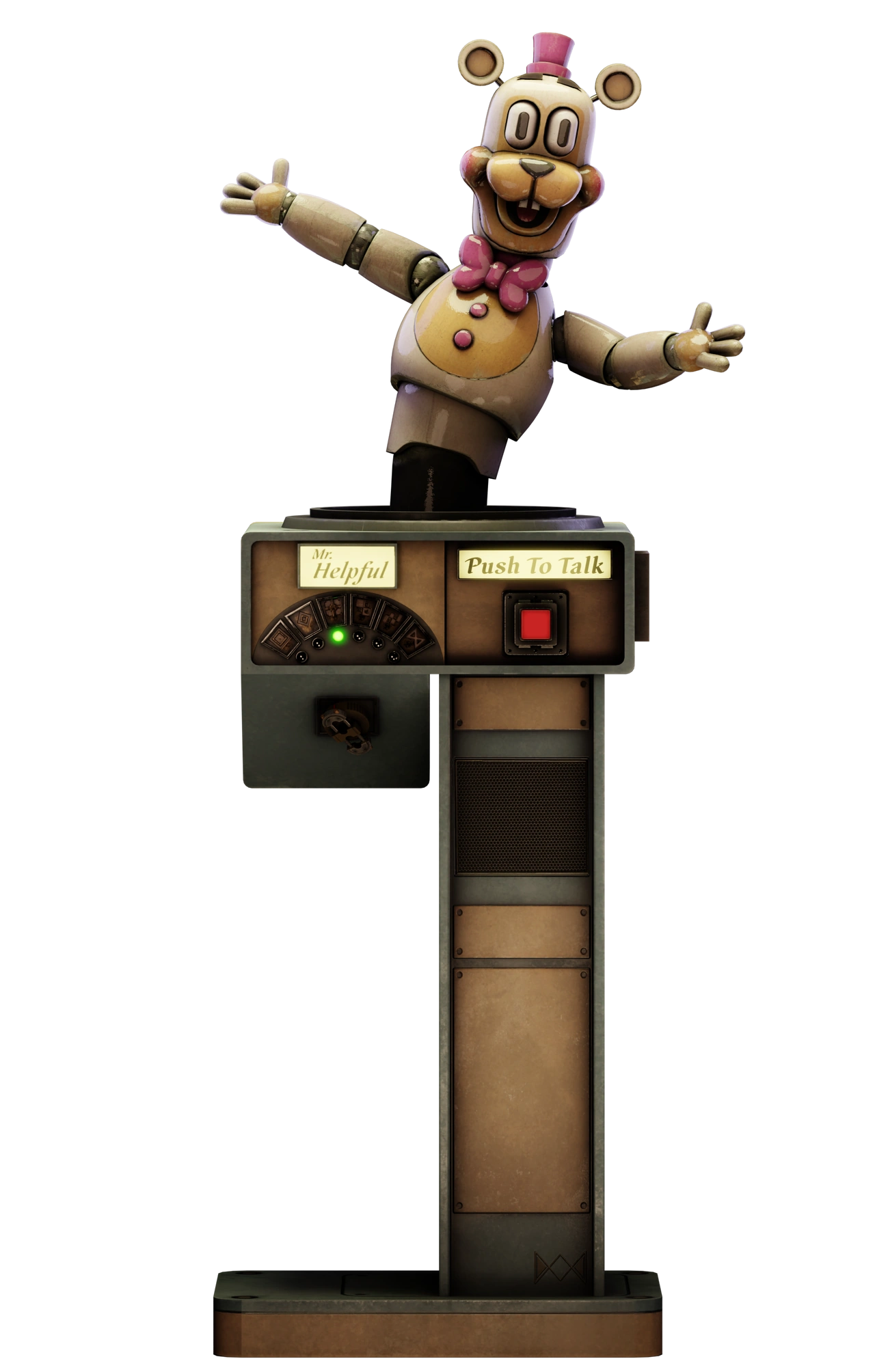 - Tuttavia, Mr. Helpful apparentemente ha lo stesso dettaglio sulle guance di Funtime Freddy. Questo dettaglio rende possibile che HELPER sia un altro prodotto o personaggio che Fazbear Entertainment, Inc. ha preso dalla fabbrica di Edwin e incorporato nel marchio Fazbear, rendendo Funtime Freddy e/o Helpy una creazione originariamente realizzata da Edwin Murray negli anni '70.
