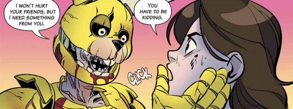 Alza lo sguardo e vede Springtrap lanciarsi contro di lei. Lei lo schiva e gli infila la punta nel petto. Si ferma e cerca di respingerla mentre lei glielo conficca ulteriormente nel petto mentre gli chiede perché ha preso Sammy invece di lei, a cui Springtrap risponde che ha preso lei e non Sammy. Mentre il tunnel sta crollando, Springtrap fugge attraverso una piccola botola nascosta con la punta ancora nel petto.