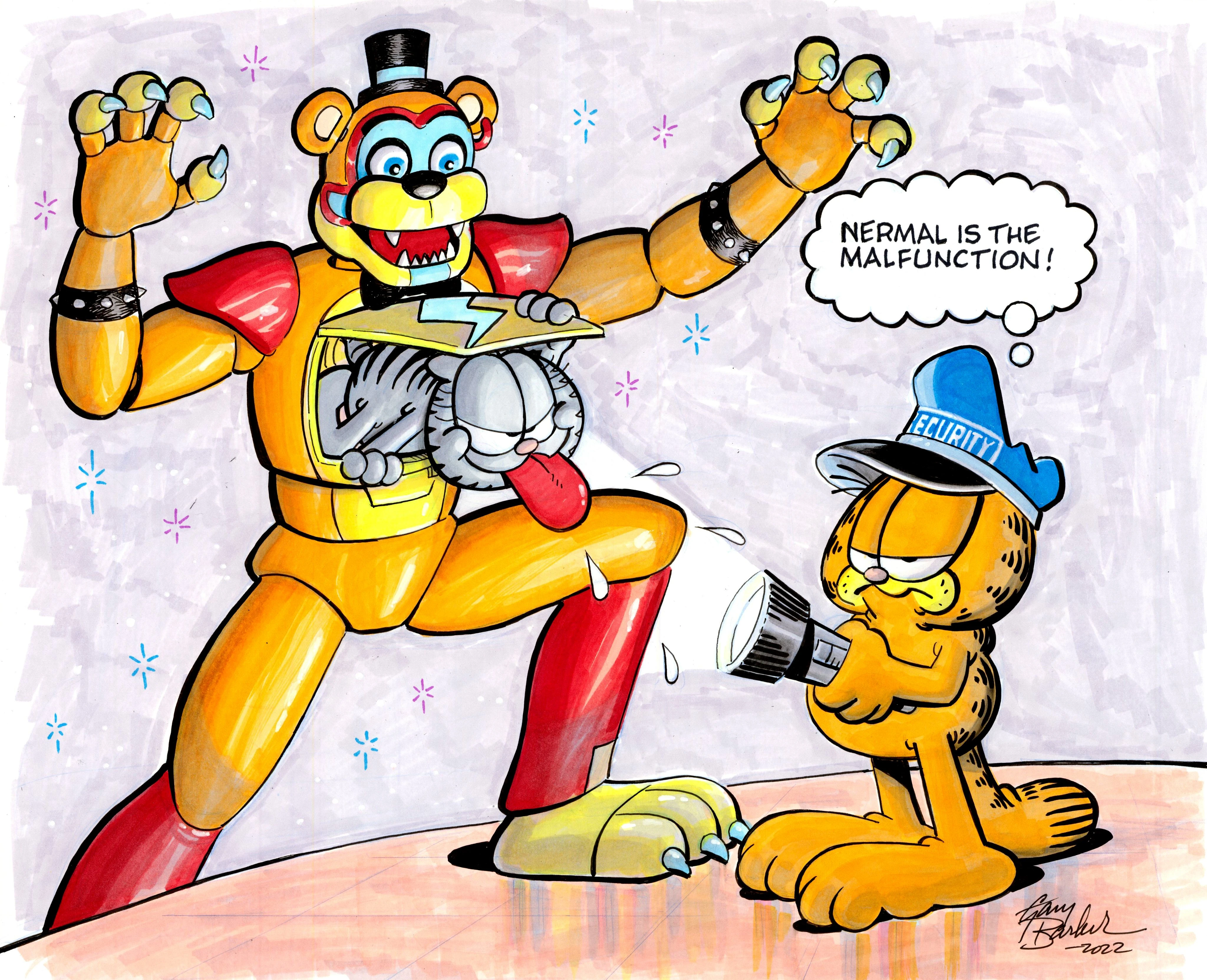 From the 2023 line of the trading card series Garbage Pail Kids, Freddy Fazbear appear in the card as "Frightening Freddy" (alternatively "Arnie-Matronic").