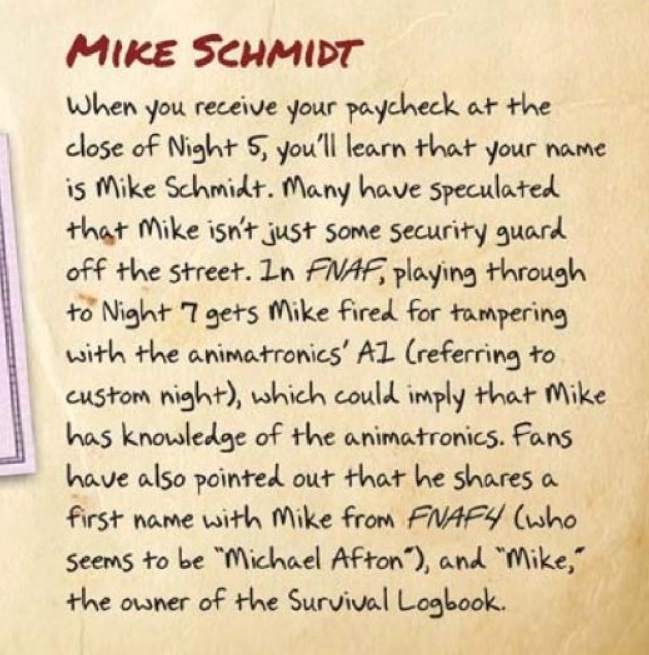 - In The Ultimate Guide, in the FNaF 1 "Lore and Theories" section, it mentions that fans have pointed out that Mike Schmidt shares a first name with "Mike from FNAF 4" with no context given.