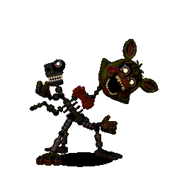 Phantom Mangle's appearance is almost identical to its core series counterpart, but it is smaller. Like most of the phantoms, its eyes are white dots surrounded by a single white ring. The same goes for the endoskeleton head. It looks identical to Mangle in design, similar to its core series counterpart, albeit with a charred and ghostly look to it.