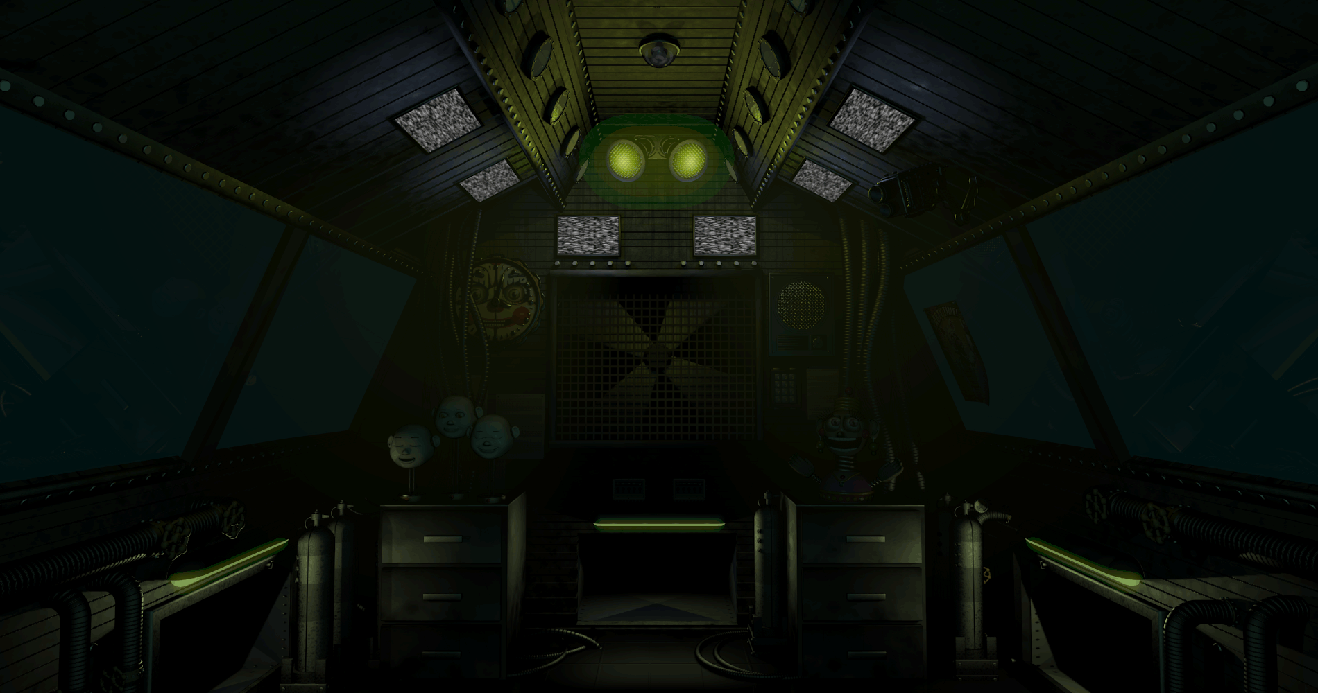 It appears to have doors that cover the vents, these doors have yellow and black warning stripes on them. On the left wall, a clock resembling Circus Baby's face can be seen. There are elevated keypads on both sides, each with two buttons. On the left side of the room is a drawer with what three faces placed on top of it, two of them blinking rapidly. On the right side of the room is another drawer with what an strange toy-like female animatronic on top of it. On both sides of the room are what appear to be monitors, presumably used to monitor security cameras, however they all display static. The right side of the roof also has a security camera installed. In the center of the room is a huge ventilator, with a white mask above it, which is later used by Ennard. During Night 5, the mask disappears.