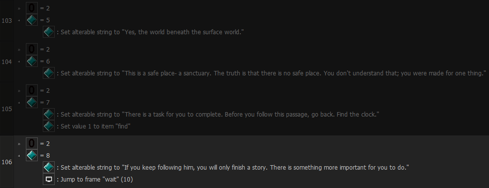 There is unused dialogue that was supposed to appear after 8-Bit Fredbear tells the player to find a clock for the first time. It technically is used; however, due to an error in the programming, the game instead automatically brings the player to the loading screen when it appears since it is the last string of text instead of adding an additional null string, making it unseen altogether. The dialogue said "If you keep following him, you will only finish a story. There is something more important for you to do."